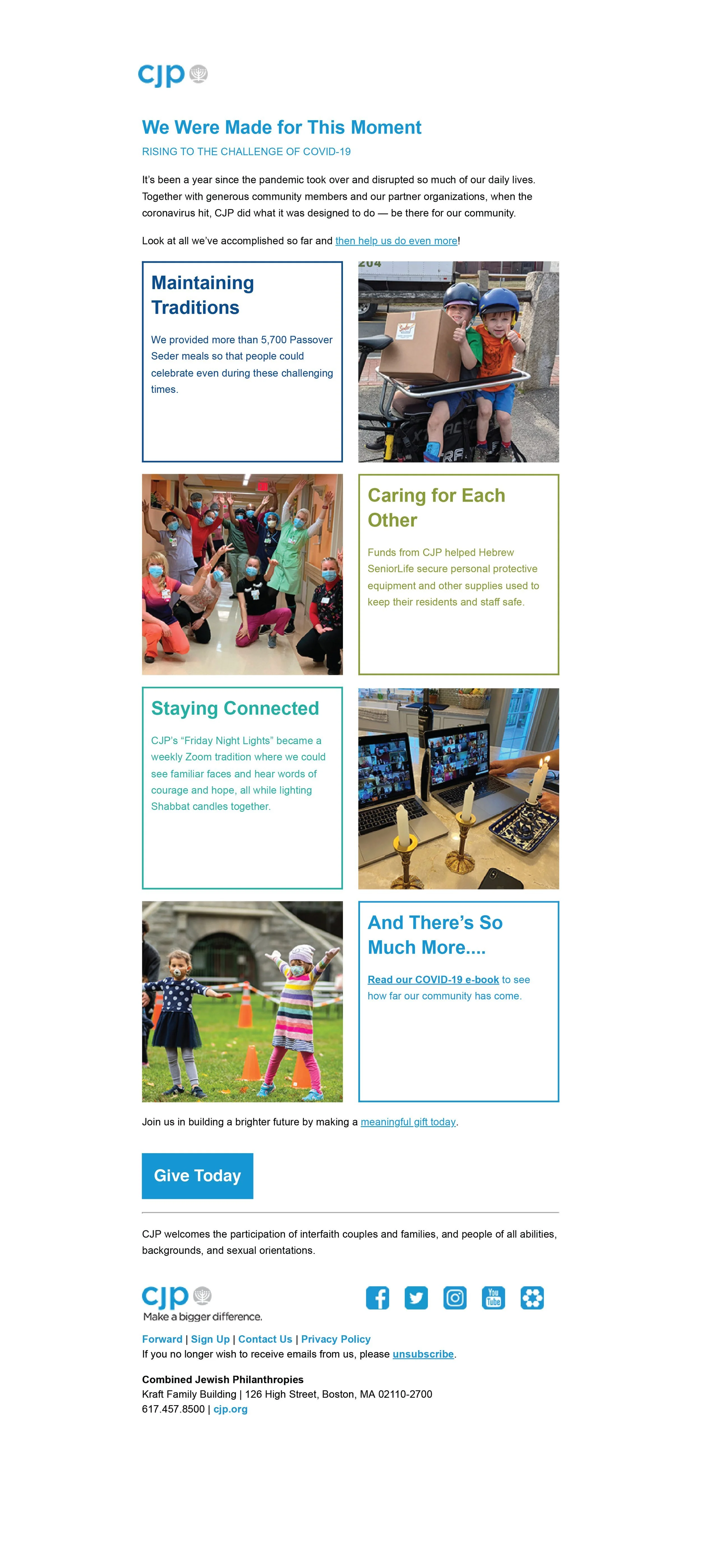 How to sum up our organization's response to the first year of the COVID-19 pandemic? We opted for an E-book that offered a broad overview of the multiple ways we adapted and distributed resources for the greatest impact. Skimmable yet comprehensive, we invited readers to experience all the good they had done through an email marketing campaign and repurposed bite-sized content for social platforms.
